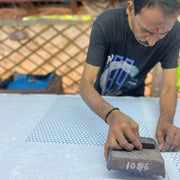 The carved wood block is then dipped in paint and stamped or pounded, typically with a hand or hammer, repeatedly onto the fabric to create the pattern. For more intricate designs, the separate colors and shapes cannot be applied until the previous layer of print is dried.