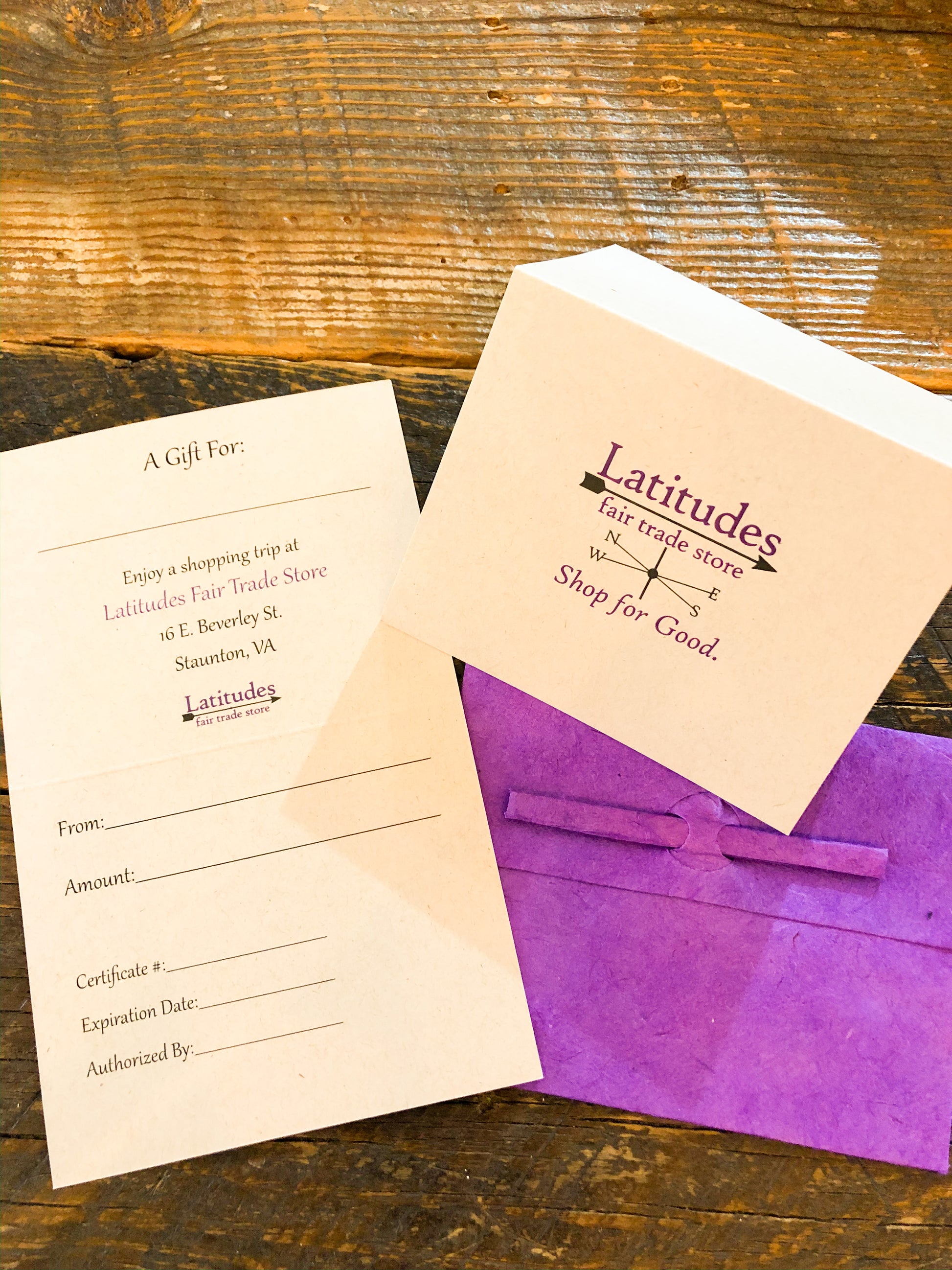 Gift certificates are the perfect option for that hard-to-buy-for person! They come packaged in a fair trade gift envelope from Nepal.